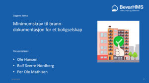 Temaet i rådgivertreffet var minimumskrav til branndokumentasjon, det også noen velger å kalle en brannbok. Ole J. Hansen, Rolf S. Nordberg og Per Ole Mathisen har laget et konsept for en slik brannbok (ringperm). Hvis det er spørsmål om branndokumentasjon, ta kontakt med Ole Hansen på tlf. 906 19 465, olejahansen@gmail.com. Han jobber til daglig med dette som brannvernrådgiver. Hvis det er ønske om å se nærmere på de malene som er laget for en brannbok (ringperm) ta kontakt med Per Ole Mathisen på perole@hms1.no. Du finner mer info om temaet, samt presentasjonen i artikkelen.