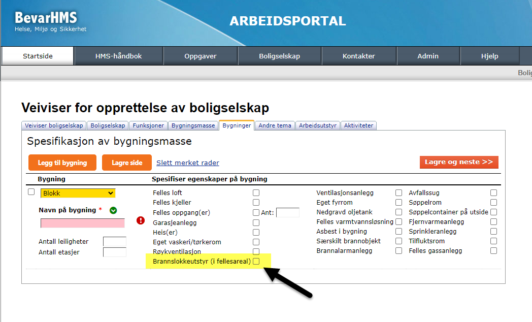 • Dersom det er krysset av for «Brannslokkeutstyr (i fellesareal)» for flere bygninger, vil det kun produseres en felles aktivitet.