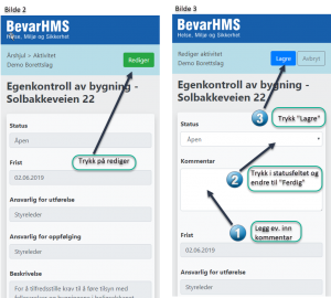 BevarHMS sender ut varsler når det nærmer seg tiden for en aktivitet, for eksempel at brannvarsler skal kontrolleres. For at du ikke skal få unødig mange påminnelser, så trenger BevarHMS at du gir beskjed når jobben er utført. Dette gjør du enkelt og greit ved å endre status fra «Åpen» til «Ferdig». Hvordan du gjør dette er forklart nedenfor. Når saken er satt som ferdig, vil du først få påminnelse når det nærmer seg neste frist for aktiviteten. Denne saken legges ut i brukerportalen.