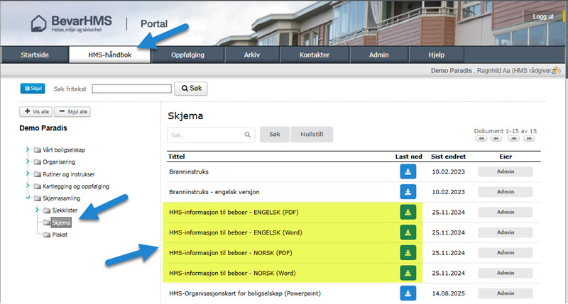 I BevarHMS finner du skjemaet «HMS-informasjon til beboere». Det anbefales, som en del av internkontrollen, at styret sender et slikt dokument årlig til beboerne. Skjemaet finnes både på norsk og engelsk. Artikkelen legges ut i BevarHMS Portal.