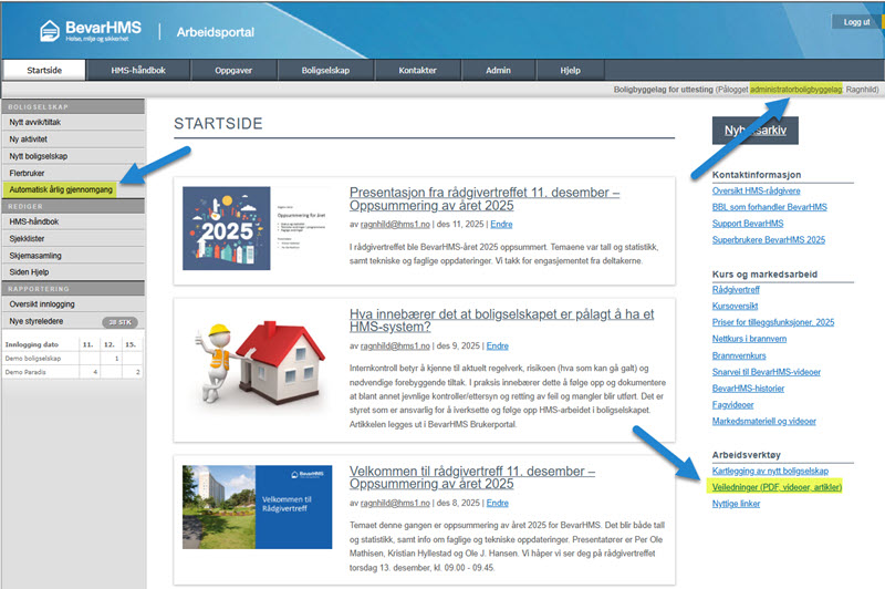 • Du må ha rolle som Administrator boligbyggelag for å få tilgang til Automatisk årlig gjennomgang. Du ser hvilke rolle du har øverst til høyre på siden.