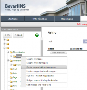 Merk mappen du ønsker å kopiere. Høyreklikk og velg «Kopier mappe inkl. undermapper» i menyen. Det er kun de med tilgang som redaktør som kan redigere mapper i boligselskapenes arkiv.