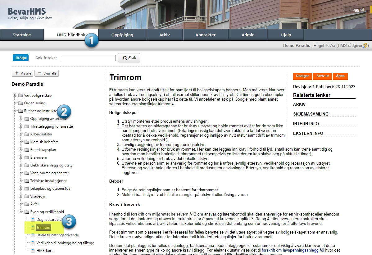 Et trimrom kan være et godt tiltak for bomiljøet til boligselskapets beboere. Det stilles noen krav til styret ved felles bruk av treningsutstyr i et fellesareal. I rutinen "Trimrom" i HMS-håndbok kan du lese mer om hvilke krav som stilles og anbefalte rutiner. Dersom du har kunder som ønsker denne artikkelen vist i HMS-håndbok, så må den aktiveres.