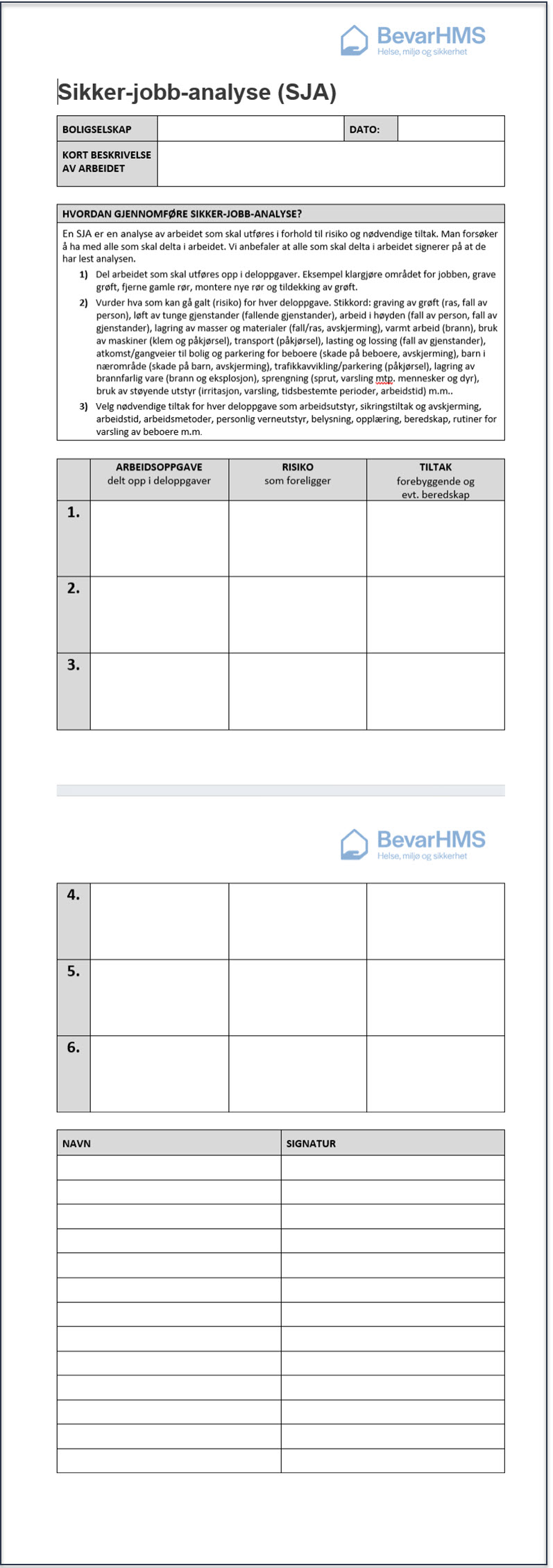 Etter ønske fra flere har vi utarbeidet en første versjon av skjema for Sikker-Jobb-Analyse (SJA-skjema). Se lenke til skjemaet nedenfor. Vi vil gjerne høre eventuelle tilbakemeldinger på form og innhold før vi legger skjemaet ut i BevarHMS Portalen i skjemasamlingen. Tilbakemeldinger kan sendes til ragnhild@hms1.no.