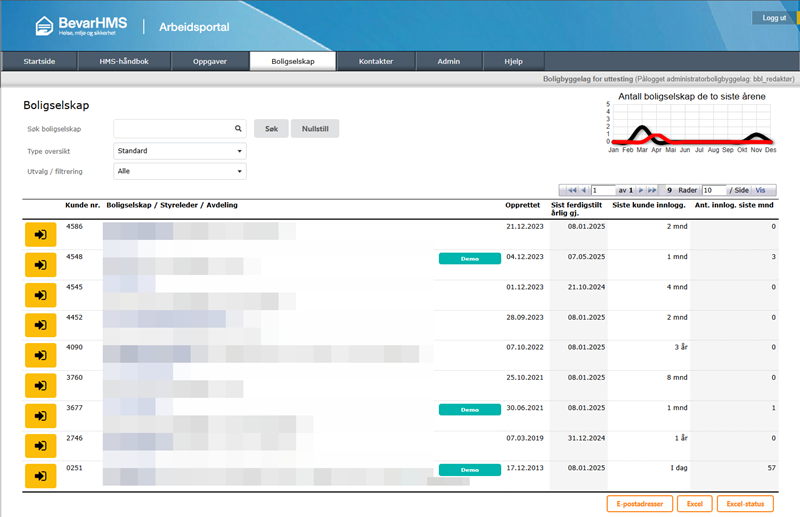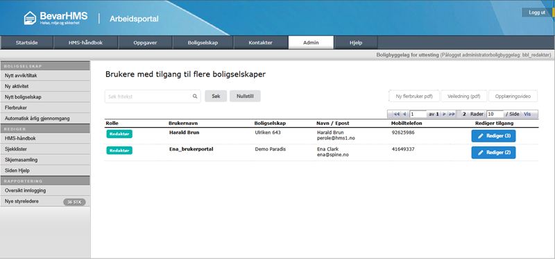 Oversikt viser nå kun de som har en flerbrukerkonto. For å finne en bruker/person bruk søkefeltet. Da vil også brukere med tilgang til kun ett boligselskap vises i oversikten. Se knapper for veiledninger over oversikt.