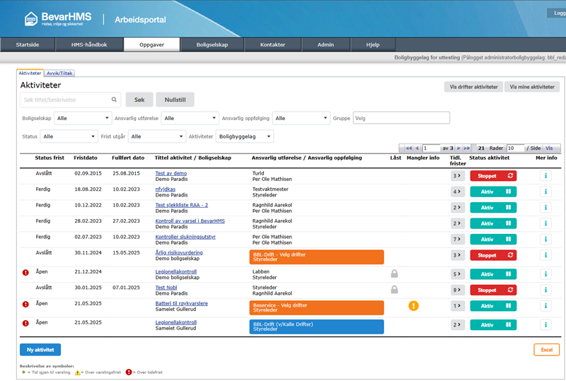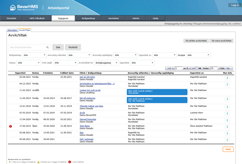 Det er lagt inn en INFO knapp til høyre der du får frem kontaktinfo til de ansvarlige. Ansvarlig for utførelse og ansvarlig for oppfølging er lagt innunder hverandre i samme kolonne. Og for de som benytter seg av Driftermodulen så er det nå lagt inn mer logikk for å vise «Oransj» som betyr at driftergruppe er valgt, men der oppgaven ikke er delegert videre til en driftsperson. Bruk av fargene oransj og blått er også implementert for oversikten for avvik/tiltak.