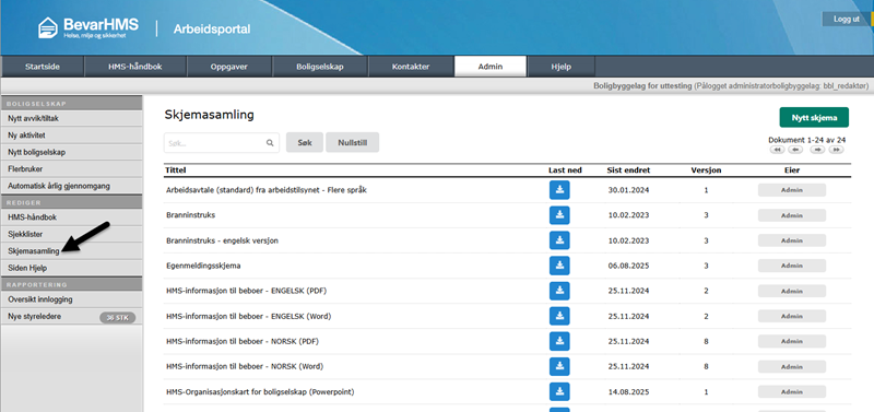 Skjermbildet over skjemasamling i Arbeidsportal er oppdatert. Dersom boligbyggelaget legger inn egne skjema som de ønsker skal vises for egne kunder, kan en velge mellom kategoriene Skjema eller Plakat.