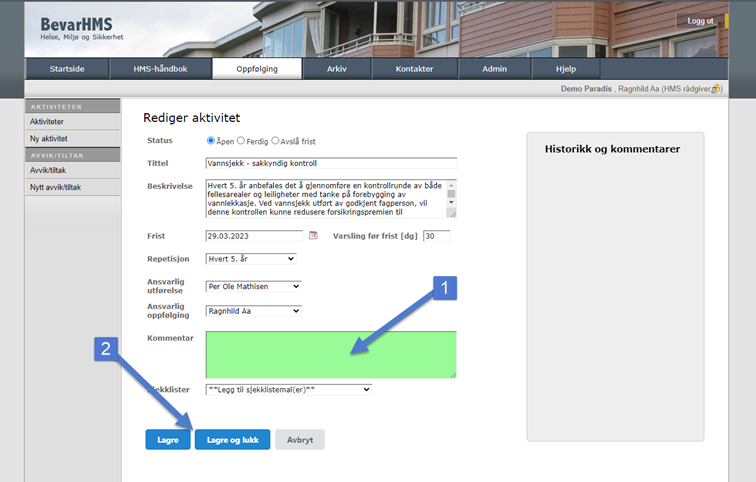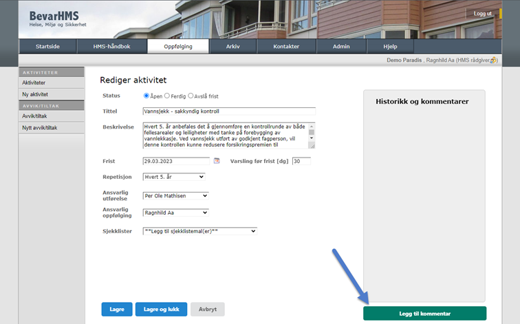 Det har kommet tilbakemeldinger på at det ved registrering av nye avvik/tiltak og aktiviteter så ønskes kommentarfeltet skjult. Dette for at det er mer naturlig at det er feltet Beskrivelse som fylles ut ved registrering av nye avvik/tiltak ellet aktiviteter. Dette er blitt løst ved en ny knapp under Historikkfeltet til høyre. Dette gjør løsningen mer i tråd med BevarHMS Oppgavebehandler og muligheten som allerede eksisterer med å kunne legge inn kommentarer på avsluttede avvik/tiltak og frister for aktiviteter.