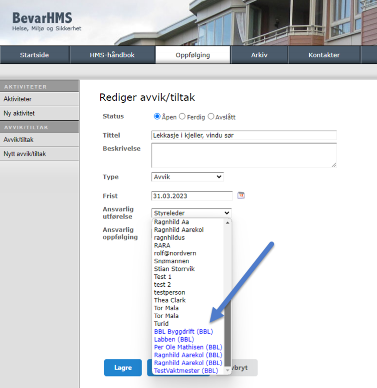 Etter tilbakemelding er rekkefølgen på nedtrekksliste for ansvarlige endret. BBL-kontakter ble tidligere vist øverst med blå farge. BBL-kontakter vises nå nederst. Bakgrunnen er at enkelte boligbyggelag har mange boligbyggelag-kontakter som medførte at boligselskapets egne kontakter ble mindre synlig.