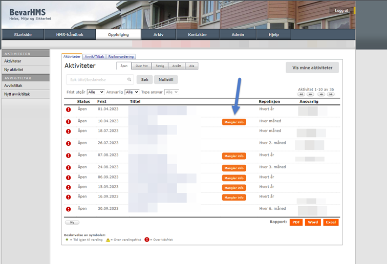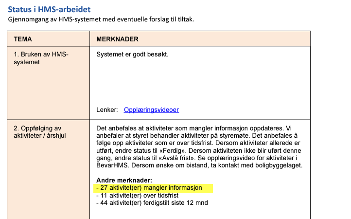 Etter en oppdatering i BevarHMS kom det tilbakemelding på feil opptelling i statusrapport av antall aktiviteter og/eller avvik/tiltak som mangler informasjon (ett av de obligatoriske feltene ikke utfylt). Årsaken hadde sammenheng med sletting av kontakter som også var ansvarlig for enten aktiviteter og/eller avvik/tiltak. Feilen er rettet og opptelling i statusrapport er igjen korrekt, se bilde nedenfor.