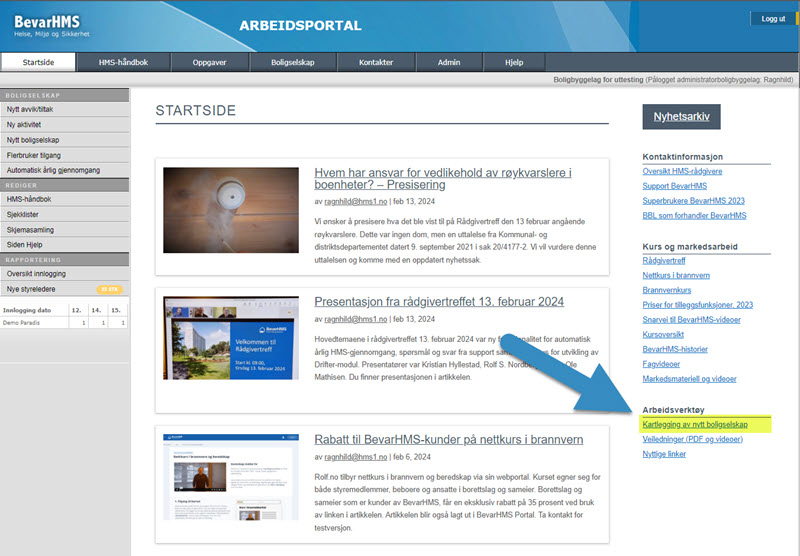 I Arbeidsportalen finner du et skjema i Word-format som kan brukes i forbindelse med opprettelse av BevarHMS til ny kunde. Skjemaet samsvarer med feltene som fylles ut i veiviseren i Arbeidsportalen når en oppretter nytt boligselskap. Skjemaet er oppdatert 14. februar 2024.