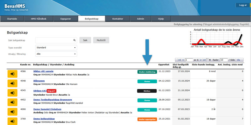 Ved opprettelse av nye boligselskap blir status satt automatisk